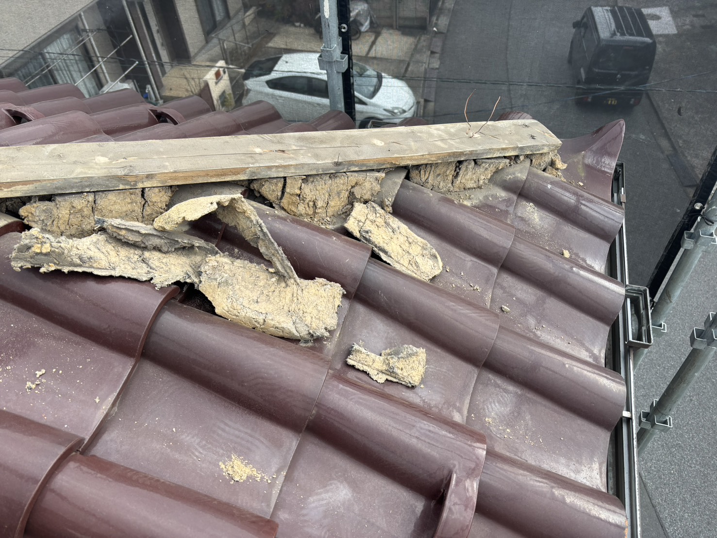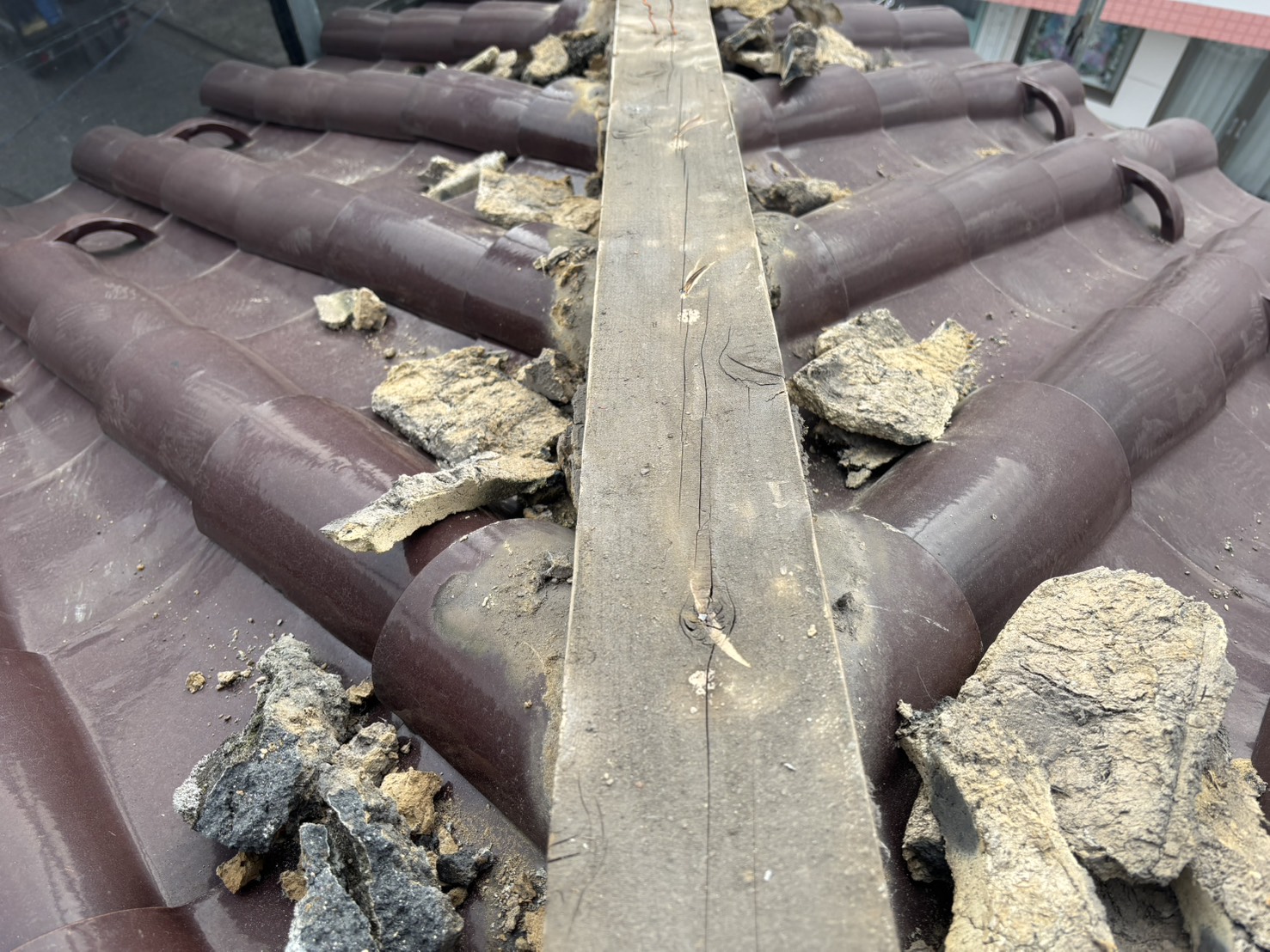 棟瓦は、内部に「葺き土」や「漆喰」を使って固定されていることが多く、長年の経年劣化によって崩れたりズレたりすることがあります。